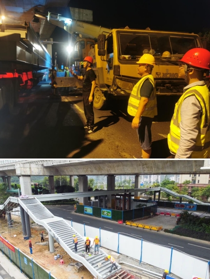 由于人行天橋項目建設(shè)所處的位置地下含高壓線等管線,施工環(huán)境較為復(fù)雜,且又處在交通通行量大的東環(huán)高速高架橋下,由于空間受限,鋼箱梁吊裝與高架橋最近的距離僅有5公分,吊裝難度極大。為此,我們采取雙吊車協(xié)同施工、錯峰施工和夜間施工的辦法。為確保施工安全,市政集團(tuán)從上至下高度重視,由集團(tuán)領(lǐng)導(dǎo)帶隊,項目總工及各職能部門主要人員齊上陣,從交通協(xié)調(diào),運(yùn)梁車跟隨指導(dǎo),安全措施落實(shí)及現(xiàn)場架梁的線位等多方面進(jìn)行把控,主要負(fù)責(zé)人靠前指揮,帶領(lǐng)黨員干部及時協(xié)調(diào)解決吊裝過程中遇到的問題,充分發(fā)揮出黨支部戰(zhàn)斗堡壘和黨員的模范帶頭作用。