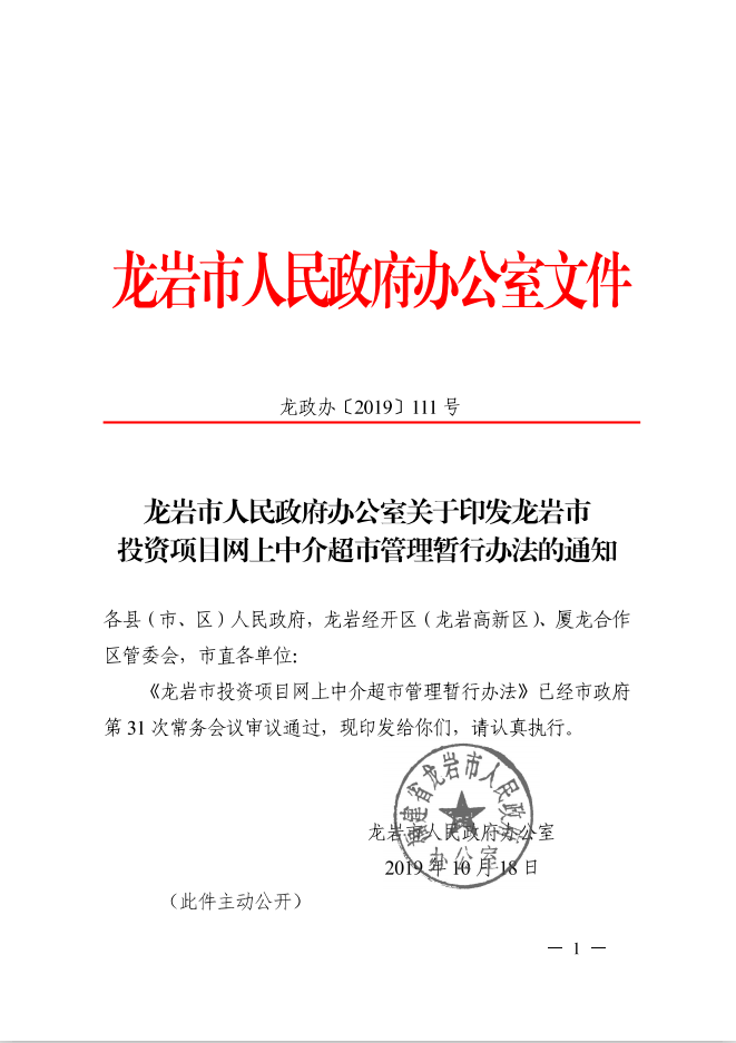 龍巖市人民政府辦公室關于印發(fā)龍巖市投資項目網(wǎng)上中介超市管理暫行辦法的通知(龍政辦[2019]111號)