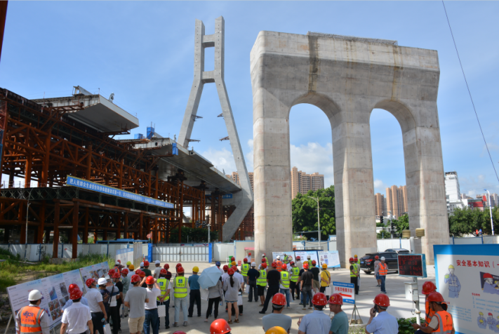 2020年6月28日,由龍巖城市發(fā)展集團(tuán)有限公司主辦,龍巖市政建設(shè)集團(tuán)有限公司(市城投公司)承辦,北京鐵研建設(shè)監(jiān)理有限公司、中國(guó)建筑第六工程局有限公司、中冶(上海)鋼結(jié)構(gòu)科技有限公司協(xié)辦的龍巖大道高架橋項(xiàng)目質(zhì)量安全標(biāo)準(zhǔn)化觀摩會(huì)在龍巖大道高架橋主橋鋼箱梁工程現(xiàn)場(chǎng)舉行。觀摩會(huì)分拼裝區(qū)域、提升站區(qū)域、頂推滑移區(qū)域、步履滑移區(qū)域及主橋轉(zhuǎn)體區(qū)域分別展示了龍巖大橋主橋鋼結(jié)構(gòu)拼裝、提升、弧形頂推滑移、步履滑移等新工藝及主塔“水平二次轉(zhuǎn)體”鋼箱梁頂推、斜拉索施工技術(shù)。